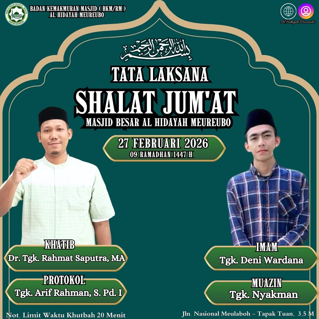 Aceh Barat — Ketua STAI Darul Hikmah Aceh Barat, Dr. Tgk. Rahmat Saputra, MD, dipercaya menyampaikan khutbah Jumat pada pelaksanaan Shalat Jumat di Masjid Besar Al Hidayah Meureubo, Jumat (27/02/2026), yang bertepatan dengan 9 Ramadhan 1447 H.